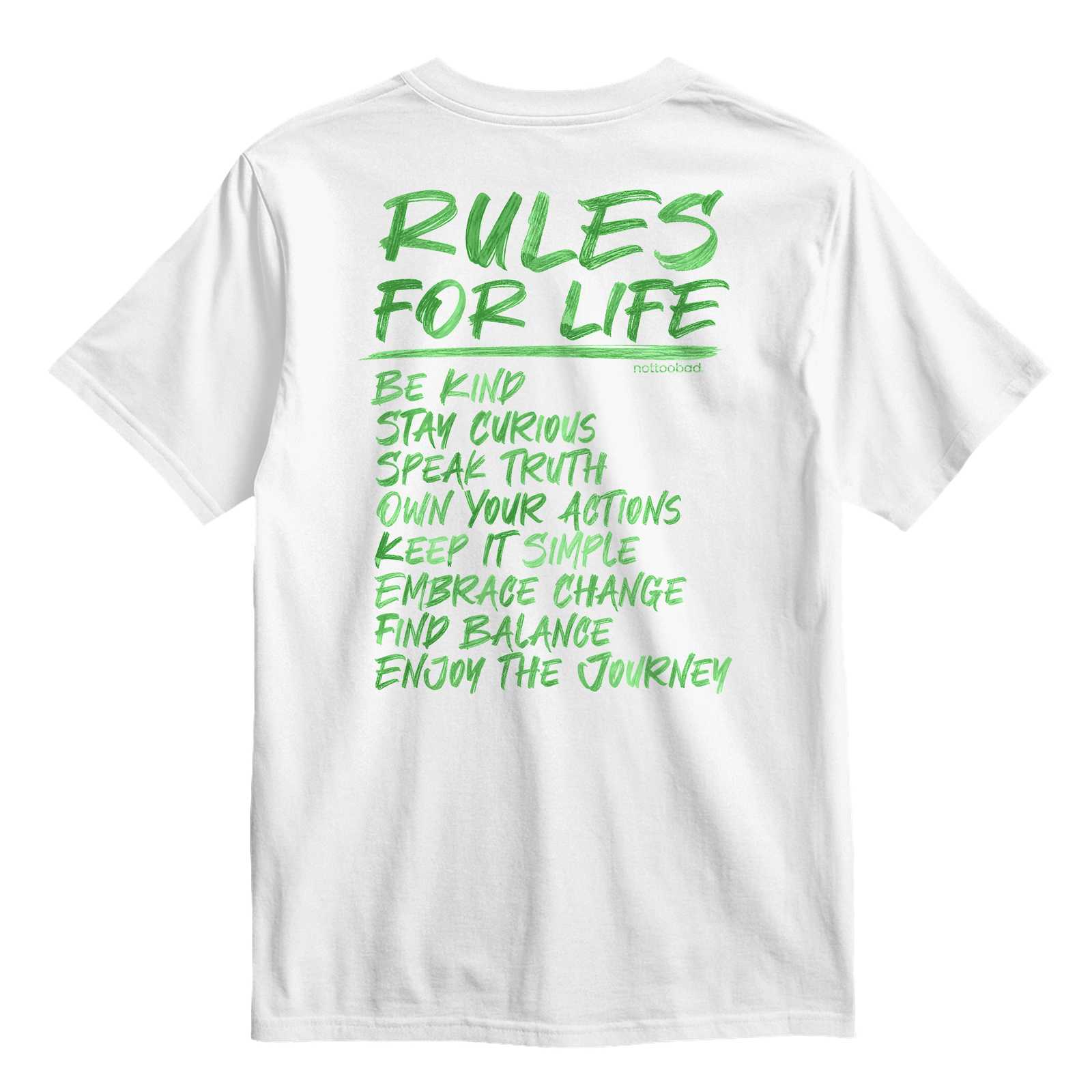 Scribbled wisdom in high‑vis green. Front keeps it coy, back hits you with eight rules your nan would approve and your mates will screenshot. It’s a pep talk you can chuck in the wash.